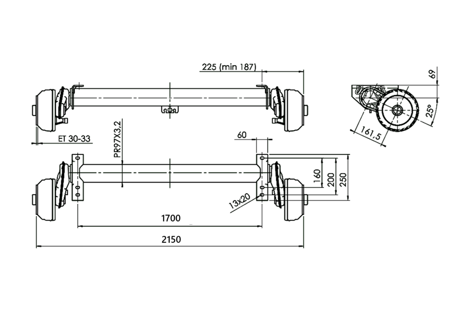 L'asse frenato del produttore AL-KO è destinato a rimorchi pesanti o autotreni con una capacità di carico massima di 1.350 kg per un asse singolo e 2.700 kg per un asse tandem . La spaziatura dei fori di montaggio è di 1700 mm, la spaziatura dei mozzi è di 2150 mm , il che consente una facile installazione in un'ampia gamma di veicoli. La configurazione dei bulloni 5x112 garantisce la compatibilità con un'ampia gamma di ruote disponibili sul mercato. La lunghezza della leva del forcellone è di 161,5 mm, il che garantisce stabilità e assorbimento ottimale degli urti, aumentando così la sicurezza di guida, anche a pieno carico.