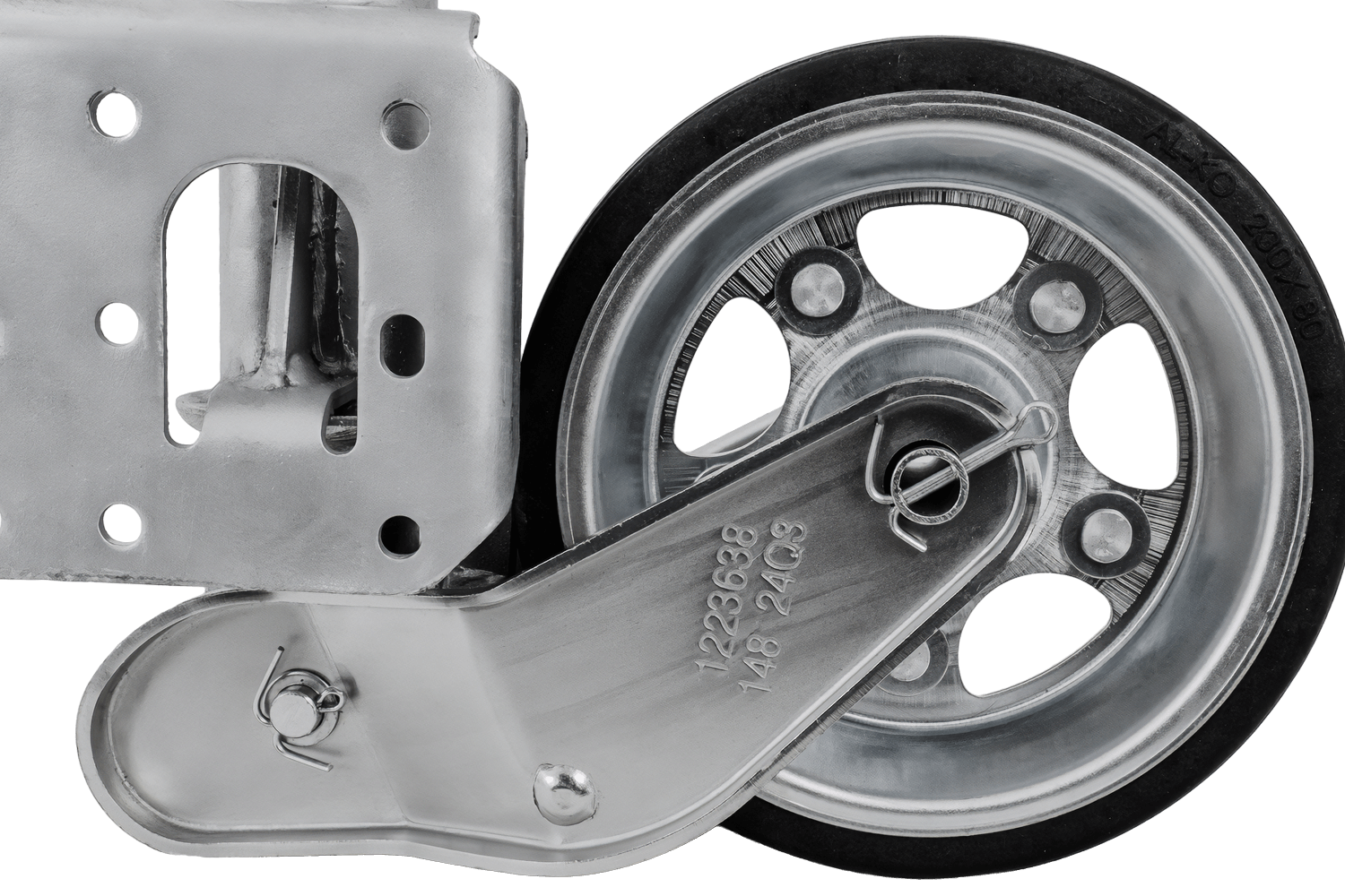 - Il ruotino di supporto AL-KO, con una capacità di carico di 500 kg, stabilizza il timone del rimorchio in posizione di parcheggio e ne facilita le manovre. La sua struttura rinforzata e la facilità di installazione lo rendono adatto ai rimorchi che richie