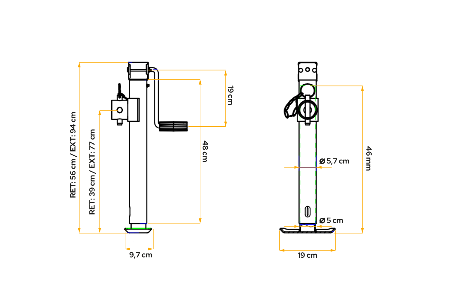 Il supporto estensibile UNITRAILER TJ5002 è dotato di un tubo di 57 mm di diametro , che garantisce una struttura solida e stabile. I supporti estensibili a manovella hanno una maggiore capacità di carico , il che li rende adatti a rimorchi più pesanti che necessitano di un supporto stabile e durevole.