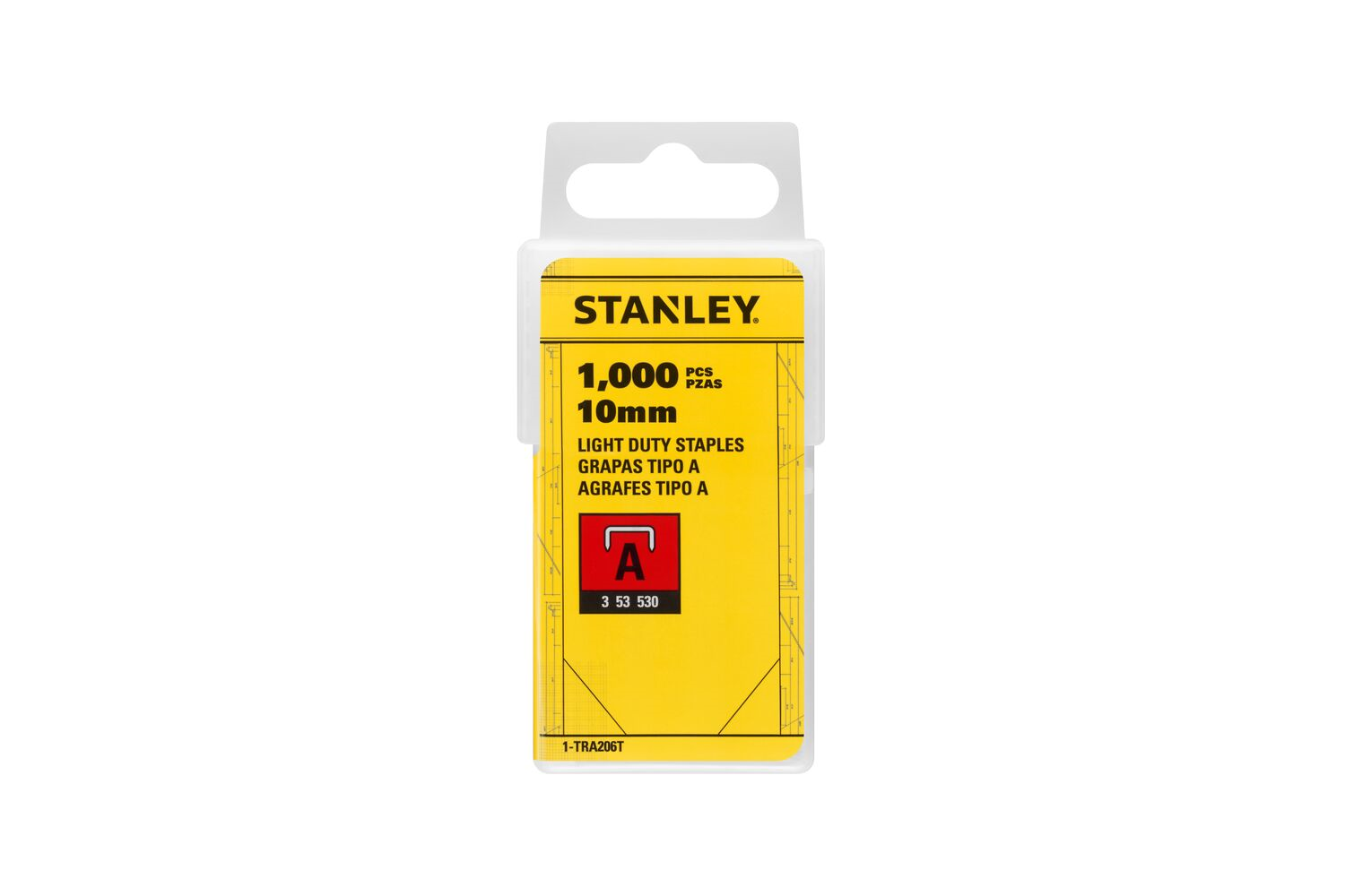 - Le graffette in acciaio Stanley 1-TRA206T (Tipo A, 3/53/530, 10 mm) sono un accessorio resistente per fissare tessuti, pellicole e reti. Realizzate in acciaio zincato, sono resistenti alla corrosione. Questo set da 1.000 pezzi è fornito in una custodia pr