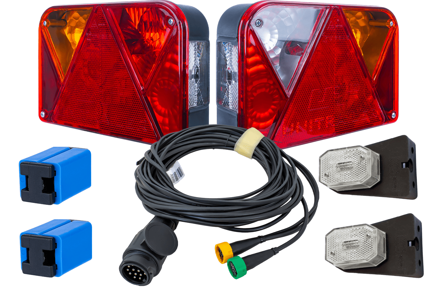 • Un kit di illuminazione per rimorchi e pianali che migliora la visibilità e la sicurezza stradale. Il kit include luci posteriori DOBPLAST DPT35, luci di posizione ASPÖCK FLEXIPOINT I e un cablaggio MANTES da 5,2 m con spina a 13 poli.