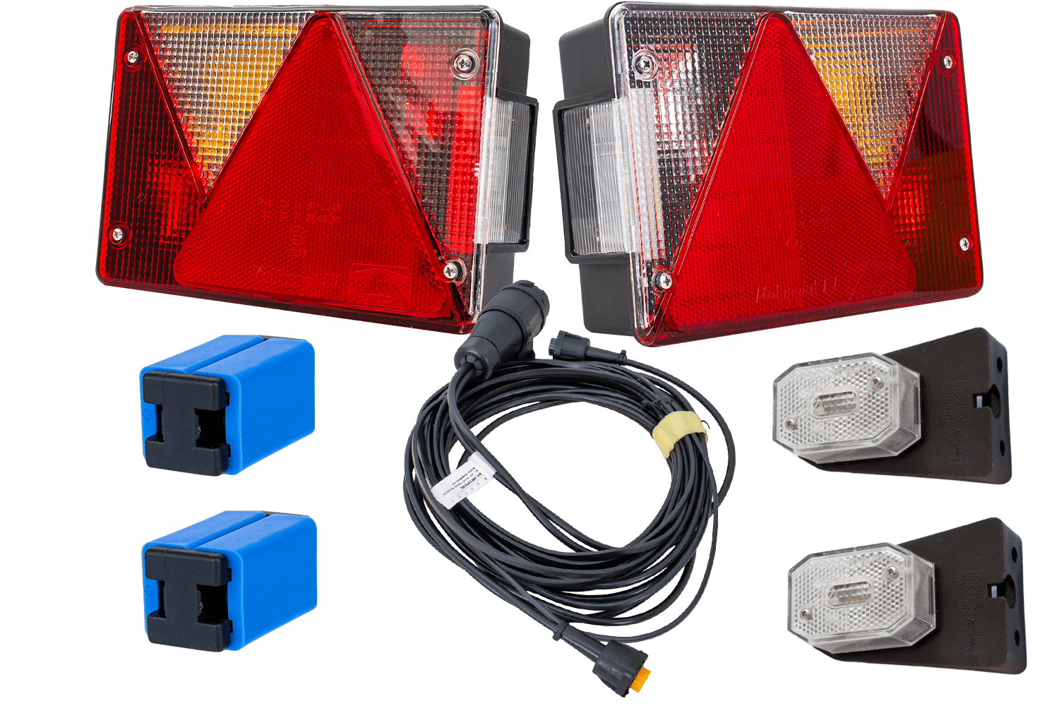 - Un kit di illuminazione per rimorchi e pianali che migliora la visibilità e la sicurezza stradale. Il kit include luci posteriori ASPÖCK MULTIPOINT IV, luci di posizione ASPÖCK FLEXIPOINT I e un cablaggio MANTES da 4,5 m con spina a 13 poli.