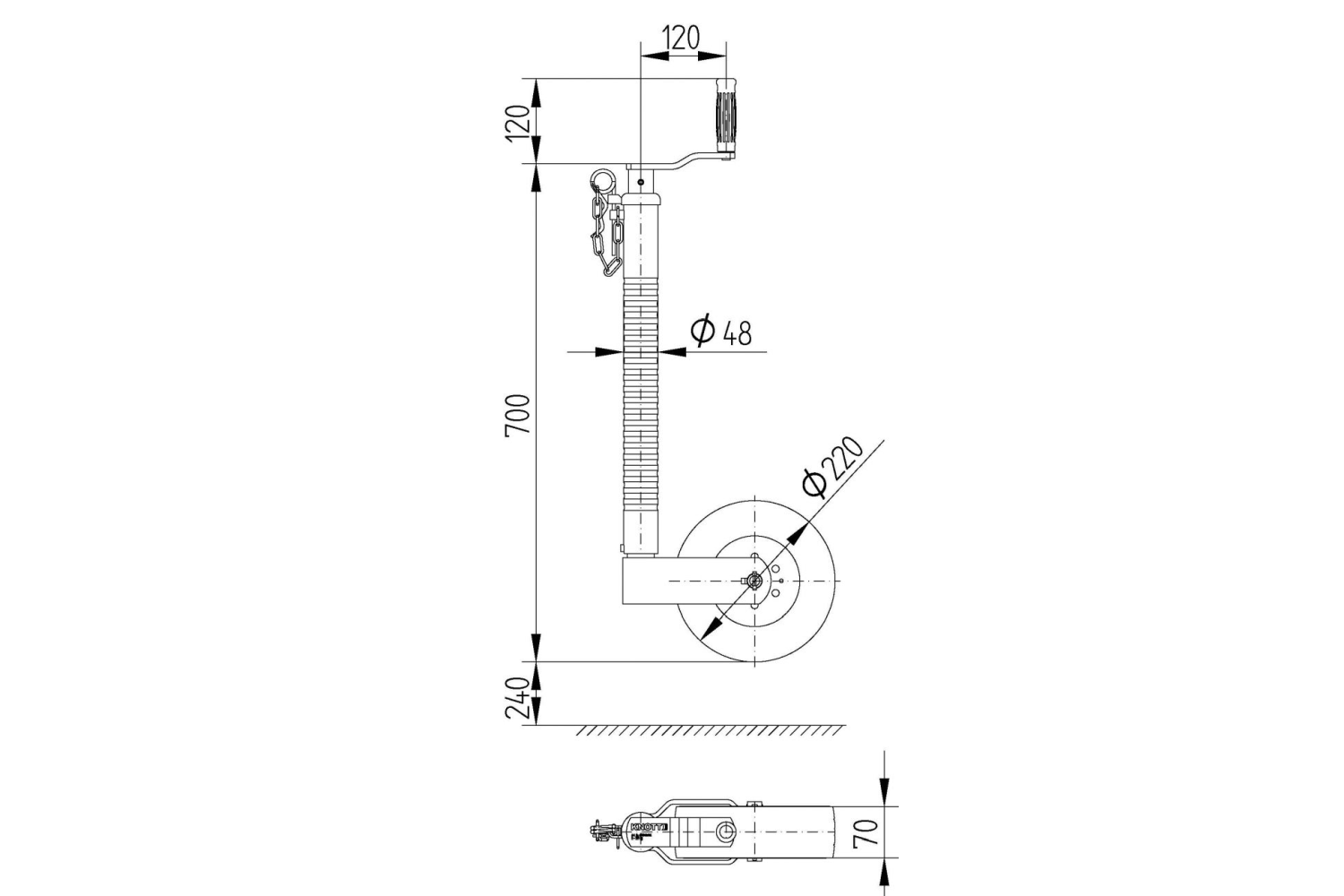- La ruota di supporto TK48 KNOTT con una capacità di carico di 200 kg stabilizza il timone del rimorchio da fermo e ne facilita le manovre. Grazie alla sua solida costruzione e alla facilità di installazione, funziona bene sia sui rimorchi leggeri.