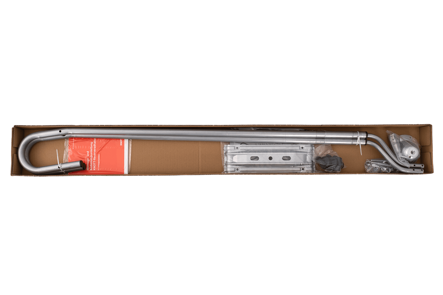 - Il portaruota di scorta KNOTT è adatto a roulotte con larghezza del telaio compresa tra 1200 mm e 1500 mm. Il portaruota di scorta viene montato sotto la roulotte, risparmiando spazio all'interno e nel vano portaoggetti anteriore.