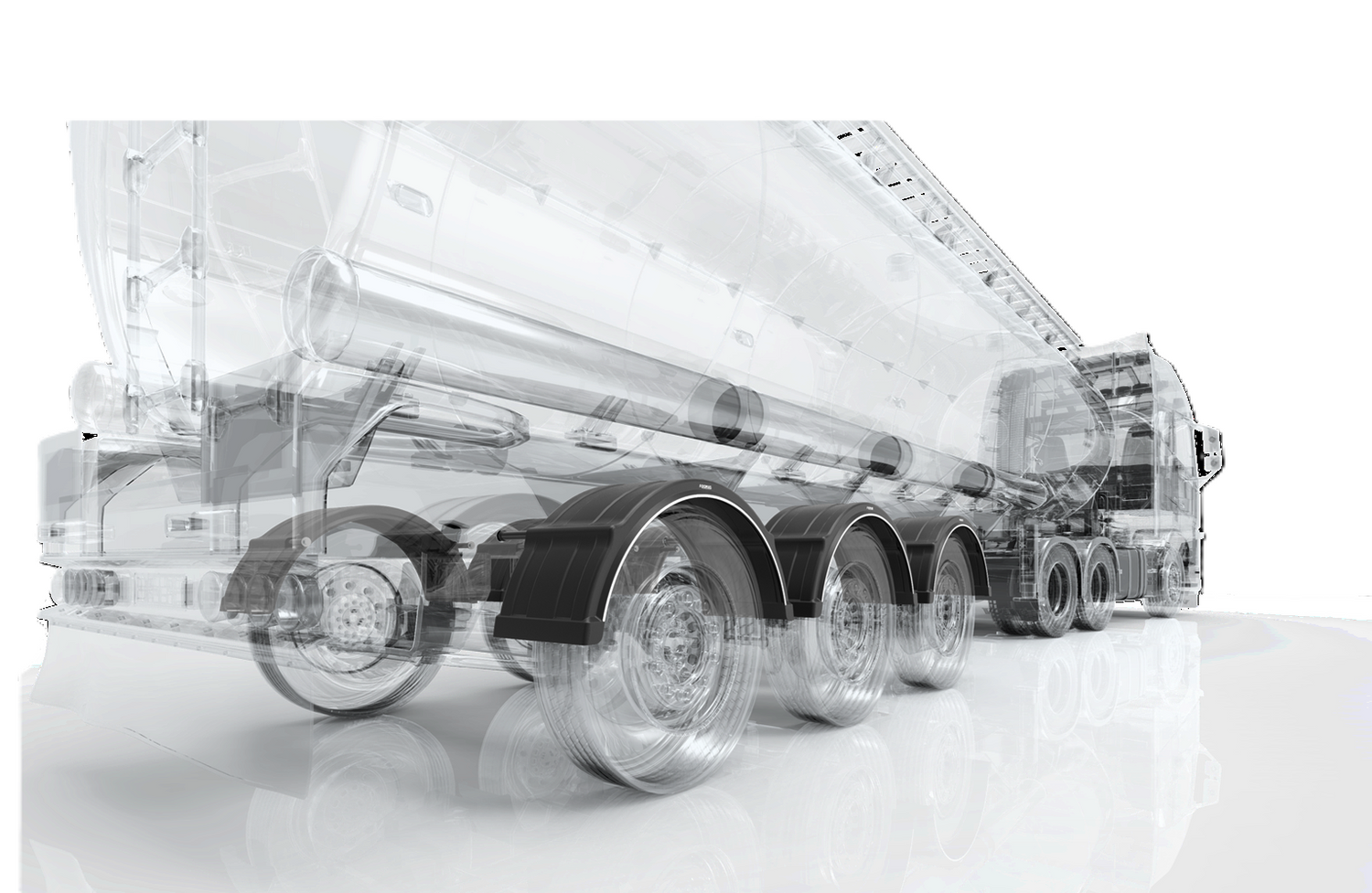 - Parafango singolo con bordo bianco DK4175 per ruote da 19,5 a 24,5 pollici, lungo 1300 mm e largo 460 mm. Protegge il rimorchio e il carico da danni meccanici e gli altri utenti della strada da schizzi di fango o pietre provenienti da sotto le ruote.