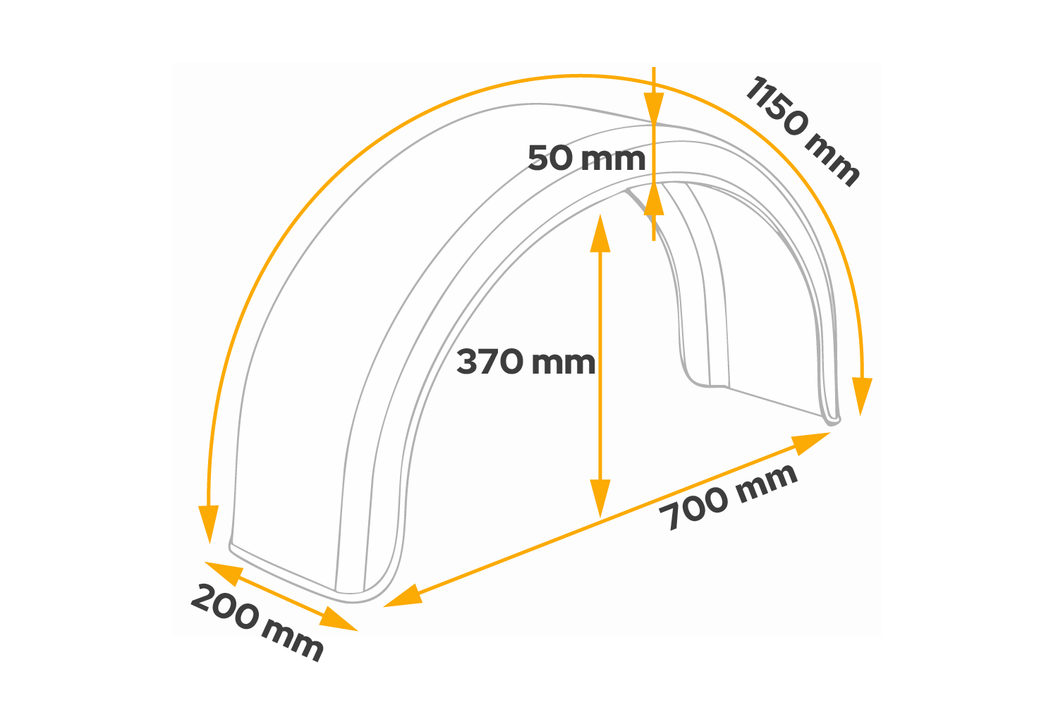 - Il parafango singolo D20200 DOMAR, progettato per ruote da 13 a 14 pollici, ha una lunghezza di 700 mm e una larghezza di 200 mm. Protegge il rimorchio e il carico da danni meccanici e gli altri utenti della strada da schizzi di fango o pietre provenienti