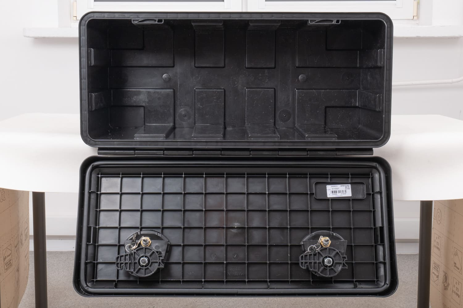 La scatola è realizzata in polipropilene e nylon di alta qualità, ulteriormente rinforzata con nervature, che ne aumentano la durata e la resistenza ai danni meccanici. Il materiale offre un'eccezionale protezione contro fuoco, acqua, polvere, carburante, raggi UV e temperature estreme , rendendola una soluzione ideale per un uso intensivo in condizioni difficili. Il coperchio della scatola è dotato di una guarnizione in gomma che garantisce la massima tenuta, impedendo all'acqua e alla polvere di penetrare all'interno . Questo design protegge efficacemente gli utensili e le attrezzature riposti da fattori esterni dannosi, il che è particolarmente importante in caso di uso intensivo in cantieri edili o in condizioni meteorologiche difficili.