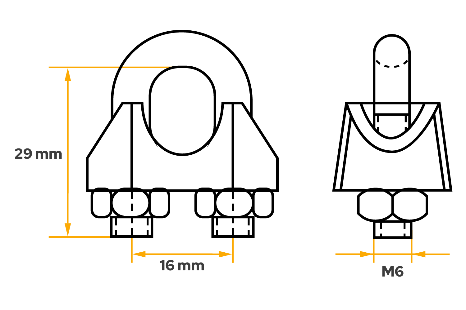 - Il morsetto ad arco ZL.8 DROMET ha una filettatura M6 e un'altezza di 34 mm ed è progettato per serrare cavi in acciaio con un diametro di 8 mm. Viene utilizzato per collegare in sicurezza cavi in acciaio, formare anelli e immobilizzarli.