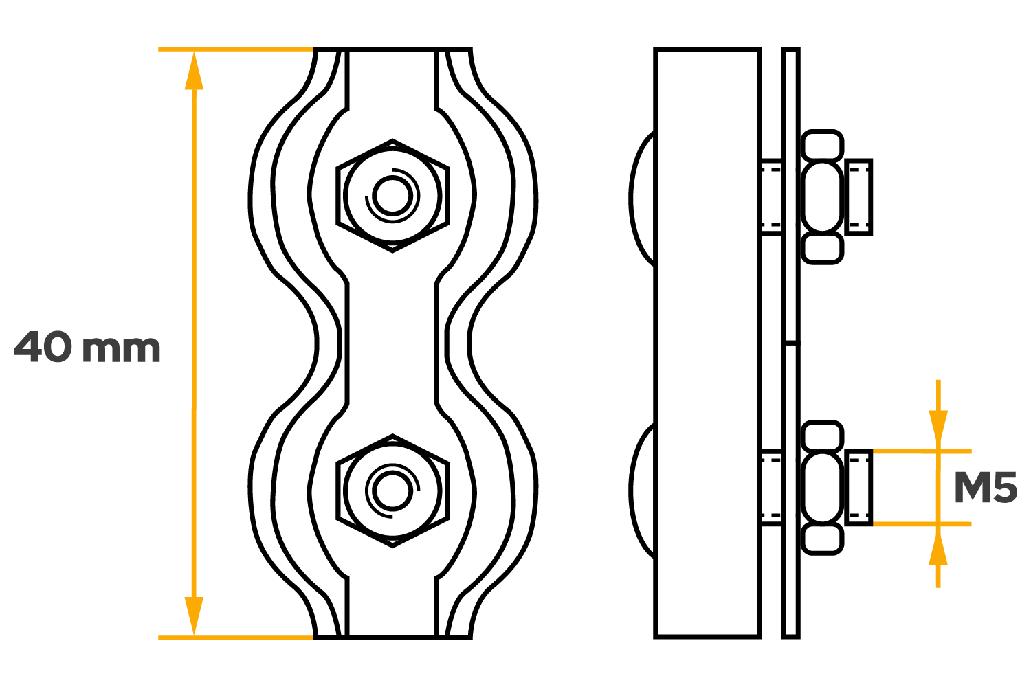 Il morsetto ZLS.4 di DROMET è un morsetto a sella doppio (di serie) progettato per collegare, fissare e bloccare cavi in acciaio con un diametro di 4 mm . Dotato di filettatura M5 e di una lunghezza totale di 40 mm , consente una tenuta stabile e uniforme della fune in due punti, aumentando la durata e la sicurezza del fissaggio. Grazie alla struttura a sella, il morsetto garantisce un montaggio rapido e un'ottima tenuta nei sistemi che richiedono una superficie di pressione più ampia.