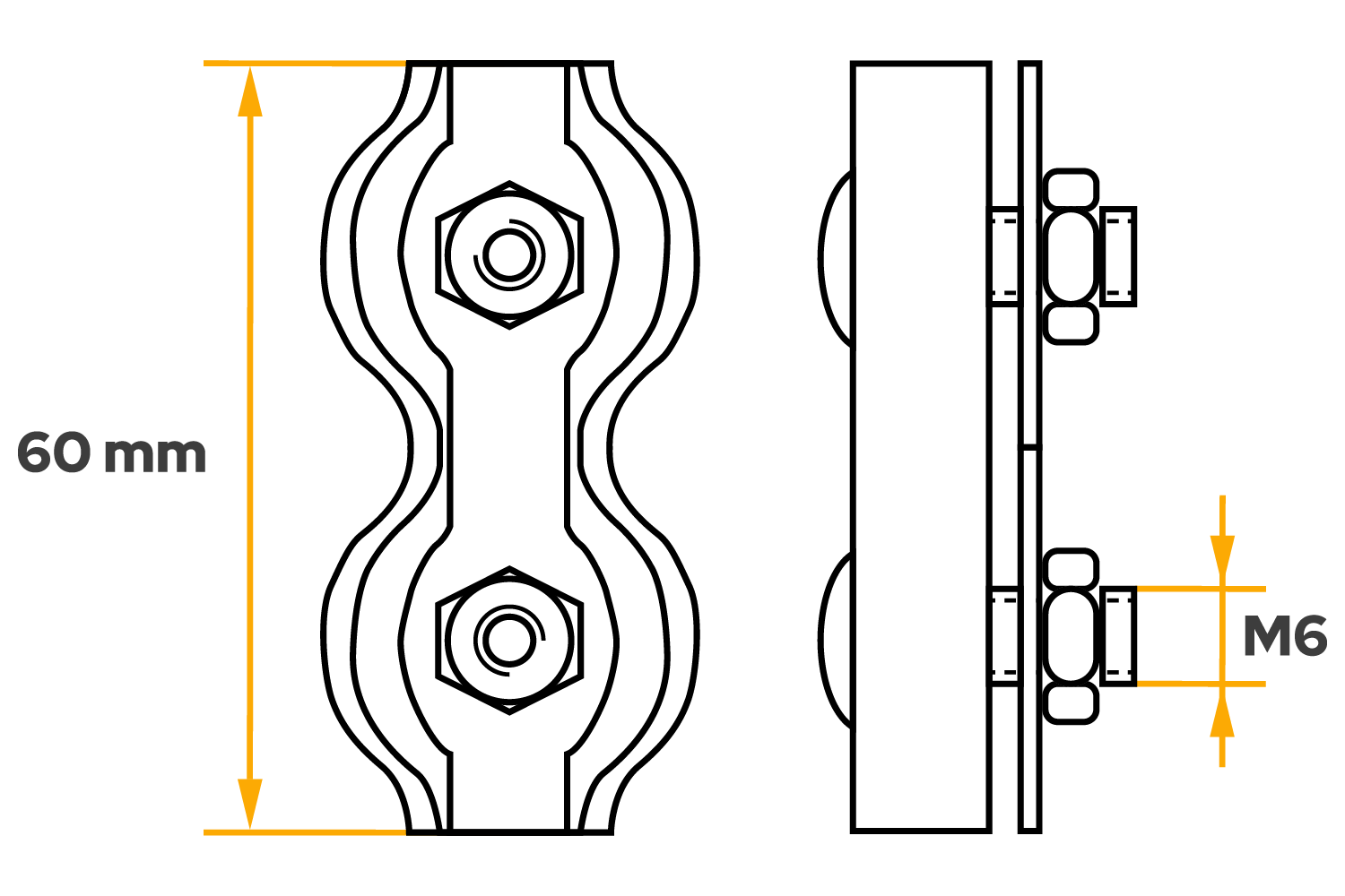 Il morsetto ZLS.6 di DROMET è un morsetto a sella doppio (di serie) progettato per collegare, fissare e bloccare cavi in acciaio con un diametro di 6 mm . Dotato di filettatura M6 e di una lunghezza totale di 60 mm , consente una tenuta stabile e uniforme della fune in due punti, aumentando la durata e la sicurezza del fissaggio. Grazie alla struttura a sella, il morsetto garantisce un montaggio rapido e un'ottima tenuta nei sistemi che richiedono una superficie di pressione più ampia.