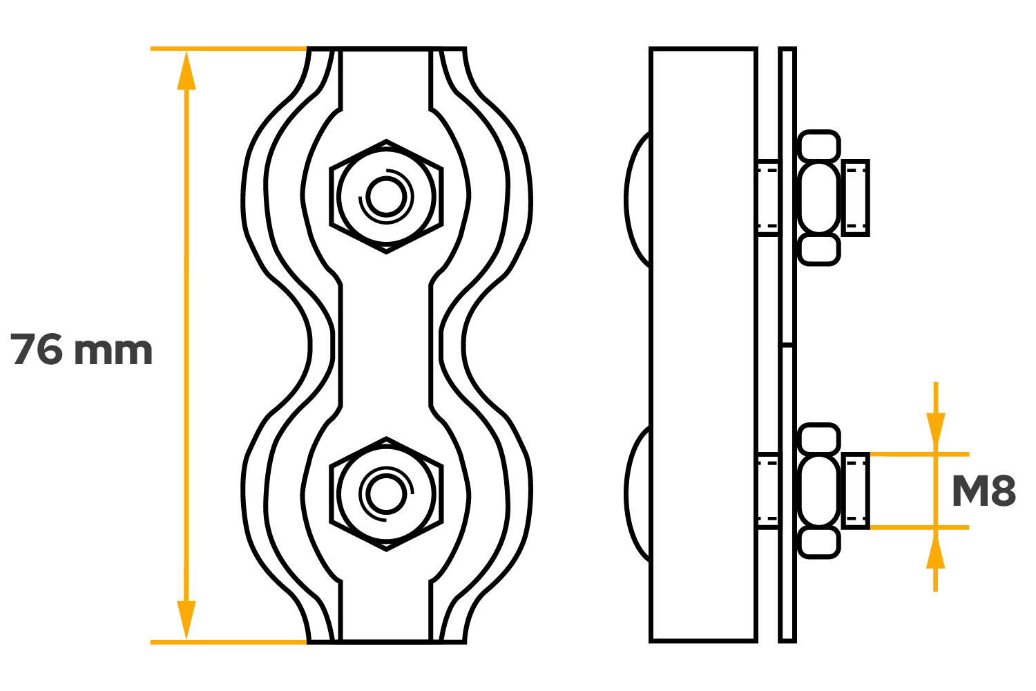 Il morsetto ZLS.8 di DROMET è un morsetto a sella doppio (di serie) progettato per collegare, fissare e bloccare cavi in acciaio con un diametro di 8 mm . Dotato di filettatura M8 e di una lunghezza totale di 76 mm , consente una tenuta stabile e uniforme della fune in due punti, aumentando la durata e la sicurezza del fissaggio. Grazie alla struttura a sella, il morsetto garantisce un montaggio rapido e un'ottima tenuta nei sistemi che richiedono una superficie di pressione più ampia.