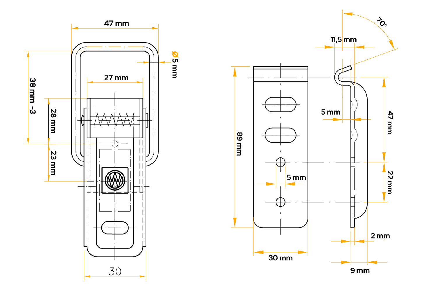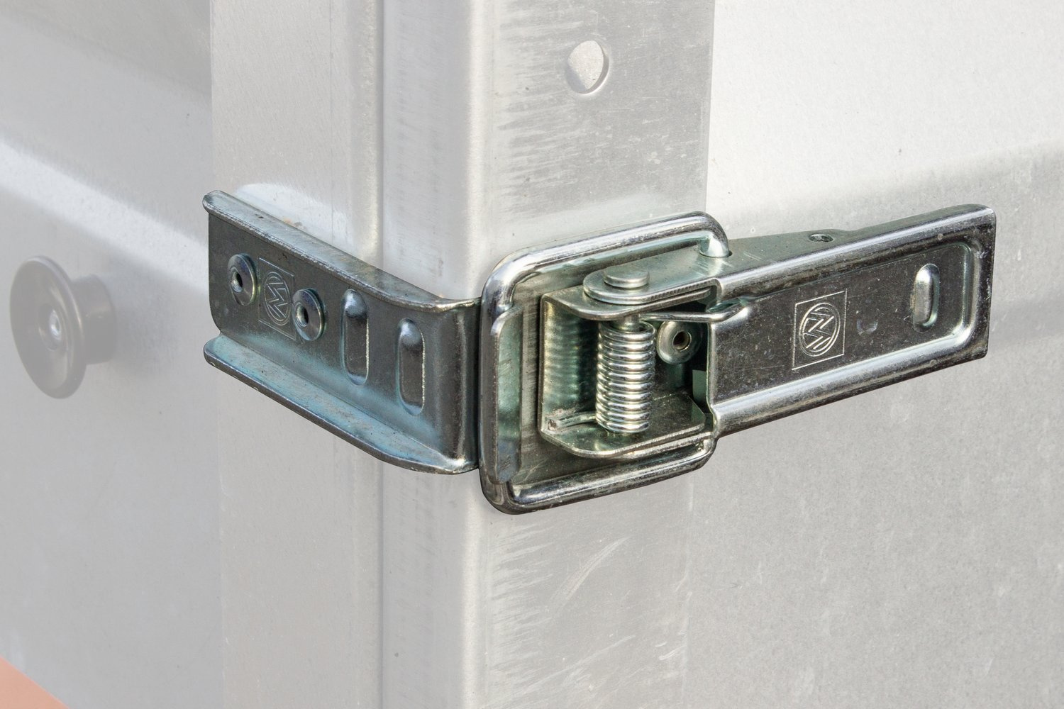 Il gancio di traino BV 60-1 è dotato di un blocco a molla integrato che impedisce l'apertura accidentale del portellone posteriore durante la guida, aumentando la sicurezza del trasporto. Il fermo BVG 60-A, lungo 89 mm, si integra perfettamente con il gancio di traino, garantendo una chiusura completa e stabile del portellone posteriore o delle fiancate.