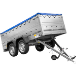 Rimorchio ribaltabile monoasse Unitrailer Garden Trailer 230 KIPP con ruotino di appoggio, sovrasponde in rete e telo piatto blu